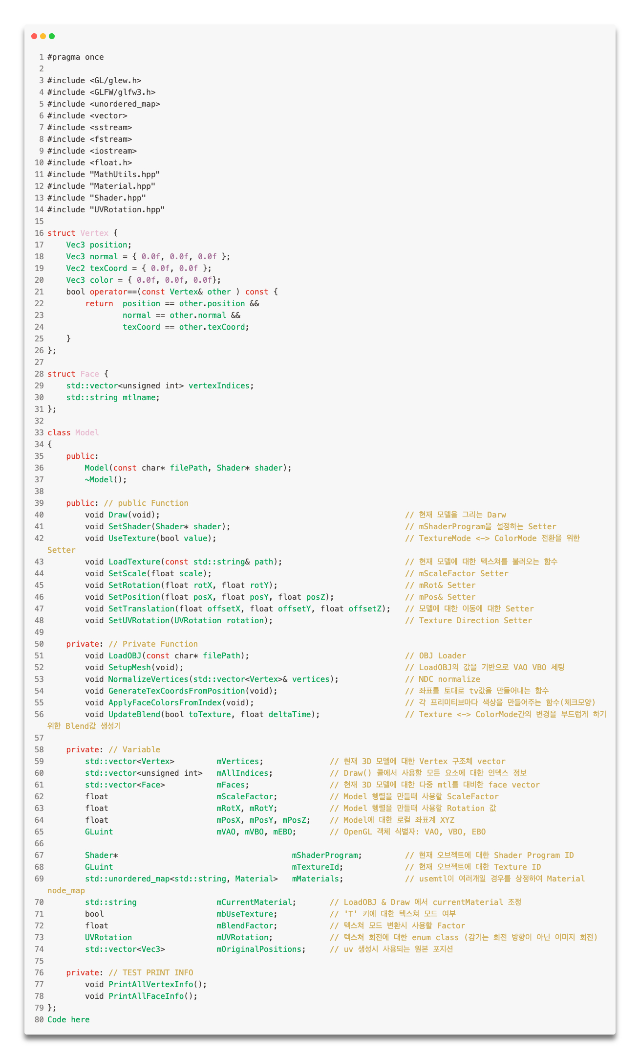 생성자에서 간단하게 초기화해야 하는 멤버 변수들을 초기화하고 Model 클래스의 핵심이라고 할 수 있는 부분인 LoadOBJ로